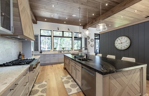 High end appliances with gas range, 2 dishwashers and 2 ovens, marble countertops, island with 4 stools, pantry with second and oversized fridge and freezer, open concept to dining area and living room, walkout to patio