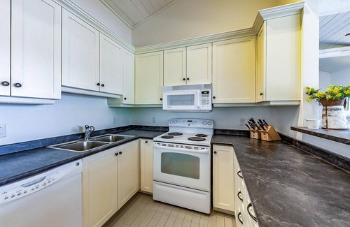 The kitchen boasts a full fridge/freezer, stove, dishwasher, sink and microwave.