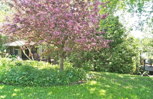 Open concept home with 3 bedrooms ,2 baths,1 outside sleeping cabins [summer only], 1 outside yoga studio,large screened deck,deck off upper bedroom,lower screened dining room porch,hot tub { May 24-Dec 15 only],steps to beach.