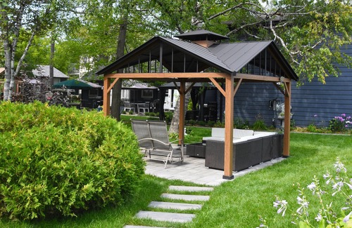 brick fireplace as well as a large gazebo with a gas fire pit for fires in the evenings