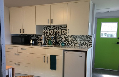 A newly renovated (interior) two-bedroom guest cottage (with a 3-piece bathroom and kitchenette that includes: a new quartz counter, fridge, sink, microwave, toaster and coffee maker) and is located directly beside the main cottage.