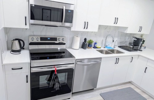 - Stainless steel stove, microwave, fridge, and dishwasher.