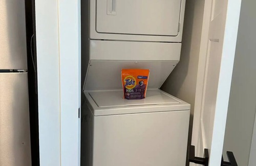 In the morning, you can prepare a warm and fresh cup of coffee using the Keurig coffee maker, and next to it, is the whirlpool laundry and dryer in case you need to do any unexpected laundry. In the living room, you find a 4K HD Smart TV and a three-person love sofa for you to join your favourite Netflix series or if you are a party of three.