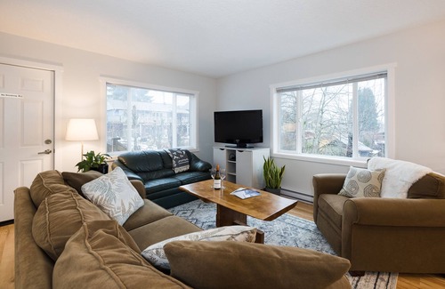 This charming two bedroom guest-suite can sleep up to four and comes with a full kitchen and bathroom. Amenities such as cable TV, Wi-Fi, free parking, bike wash, laundry, secure bike/ski storage, and a seasonal BBQ are provided. Our comfortable queen-sized beds and well-stocked units supply everything that you need while away from home. Check yourself in and out with our automated key-pads and explore the area without worrying where you put the key.