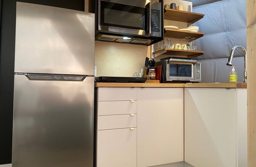 This dome is equipped with a full kitchen and bathroom, bedding and towels, a queen-size bed on the mezzanine, a sofa bed and a terrace with a gas BBQ (except in winter). We offer your first dose of locally roasted coffee, oil, sugar, salt, pepper and products from Percé's Poussière d'Étoile soap factory.