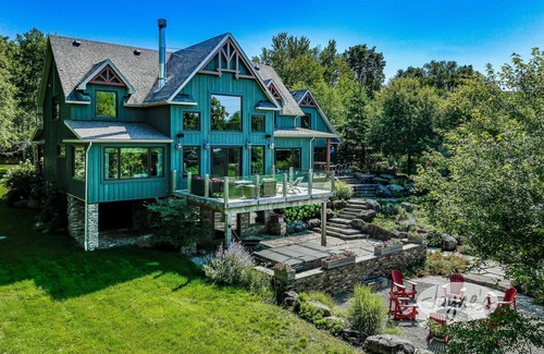 GREAT TOTEM HOUSE - Arrive via a winding driveway through the woods, past a pond, to the stunning chalet! Set on 1.3 acres of wooded and grassy lawn, this property offers extreme privacy. The front veranda offers the best spot to enjoy your morning cup of java! Around back, beautiful landscaping features granite stone stairways adorned with gardens. The upper deck off the living room features an outdoor sofa nestled around a fire table. The lower flagstone patio features 2 chaise loungers and an oversized hot tub. It continues down, around to the fire pit area with 6 red Muskoka Chairs.