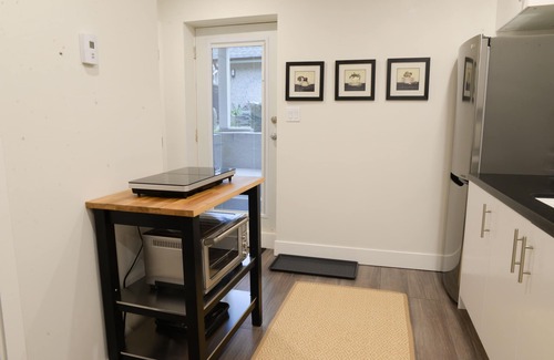 This suite is located approximately four steps down from a tranquil, sun-drenched garden with waterfall, ponds and patio. Ceilings are a clear eight-feet throughout the suite. The bedroom boasts a luxurious pillow-top king size mattress and walk-in closet. Living room includes a queen size pull-out sofa, cozy electric fireplace and 50" Smart TV. Kitchen is well equipped with all new appliances, dishes, basic pantry supplies and everything you will need for your stay. Bathroom includes full size tub and all new fixtures. The kitchen, bath and entry have underfloor heating and the suite has its own independent heat controls. There is a private clothes washer and dryer. The yard boasts a lovely outdoor living space where, in nice weather, you can enjoy a morning coffee or an afternoon glass of wine. Public transit is only one block away and there are easy connections to the airport, downtown and all the key Vancouver destinations.