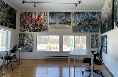 Imaginez coucher dans une galerie d'art! Découvrez ce grand logement lumineux situé au 2è étage de ce qui était un atelier de menuiserie au début du siècle dernier et qui est aujourd'hui le logement d'un artiste peintre dont les toiles originales font partie du décors. À 2 minutes de marche vous trouverez; épicerie, pub, café artistique et sympathique, pâtisserie, etc. De plus, la nature est toute proche, juste en face débute un sentier qui longe le lac d’Argent (accès publique au lac) et se prolonge dans la piste cyclable La Montagnarde (ski de fond l'hivers), qui se rends au mont Orford, Magog. Parfait pour les cyclistes, les amateurs de marche en nature, les skieurs, ou juste pour une retraite artistique paisible dans ce beau petit village des cantons de l'est. Une petite cuisinette tout équipée vous permet de faire vos repas (four micro-onde, petit four/grille pain, plaque chauffante à induction, cafetière expresso)... L'appartement est grand, il y'a bcp de pièces, il peut facilement recevoir jusqu'à 7 personnes (3 couples et une personne seule).