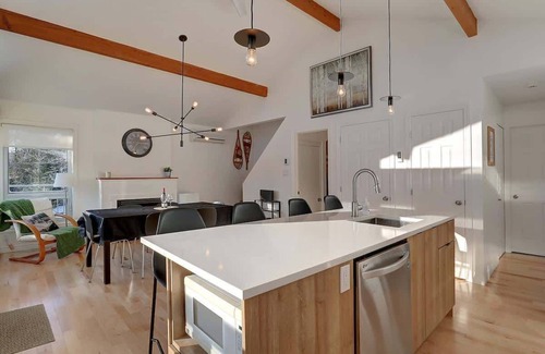This chalet near Eastman, on a landscaped lot, offers peace and family-friendly amenities, including children’s games. A short walk leads to access for launching lightweight boats on an ecological lake. The municipal beach at Lac d’Argent is a 5-minute drive (or 30-minute walk). Close to Magog, it’s perfect for a nature and relaxation getaway.