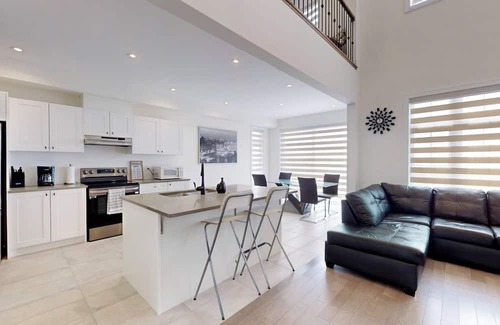 Welcome to our lakeview retreat, featuring 6 spacious bedrooms, each with a queen bed, comfortably sleeping 12 guests. The main floor includes 4 bedrooms: the master with an ensuite, another full bathroom, and a powder room. It also hosts a laundry room with a washer, dryer, and linen closet. The second floor offers 2 additional bedrooms, an open concept loft with stunning lake views, and a full bathroom. Our fully equipped kitchen includes a fridge/freezer, stove, microwave, and dishwasher. Enjoy meals in the breakfast area overlooking the lake or use the BBQ in the backyard for outdoor dining. The home is filled with natural light, complemented by blackout blinds in all rooms for a restful sleep. The open layout includes a smart TV with cable and access to streaming apps (login required) and free WiFi, ensuring both comfort and connectivity during your stay.