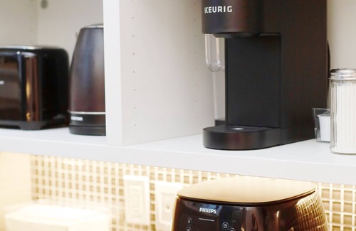 The living area features a comfortable sofa bed. It’s great accommodation for family travellers. The dining area is perfect for enjoying meals, and the well-equipped kitchenette includes a coffee maker, microwave, toaster,and a full-size fridge, offering the convenience of home-cooked meals or quick snacks. We’ve included a washer and dryer, allowing you to refresh your wardrobe as needed!
