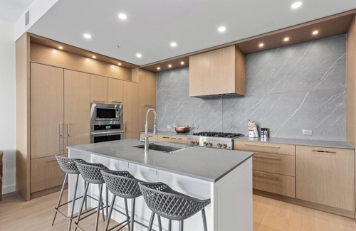 A fully equipped kitchen with quartz countertops, high end stainless steel appliances, and a breakfast island