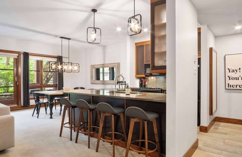 Inside you will find a thoughtfully designed space with two spacious bedrooms, the master bedroom with a king bed, and the guest bedroom with two Queen beds and each featuring its own full bathroom with heated floors, ensuring comfort and privacy to all guests. Relax on the living room's comfortable Queen sofa bed after a day of exploring and enjoy modern amenities, a natural gas fireplace, three flat-screen TVs, high-speed Wi-Fi, and air conditioning for your comfort.