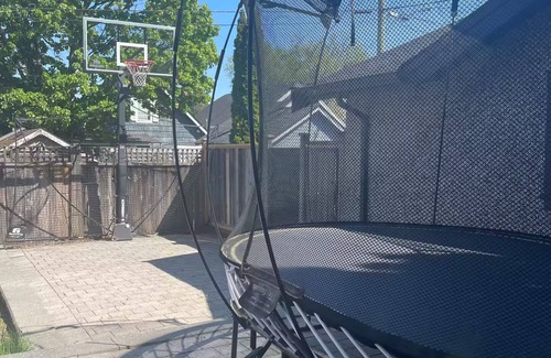 *Fenced backyard with trampoline, basketball hoop, and blueberry bushes