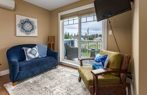 Brand new beautiful luxury suite located on 2 private acres. Our suite has a new queen size bed, small couch to watch tv, stocked kitchenette (bar fridge, microwave, toaster, coffee maker, kettle, stove burner (no oven), dishes, and assorted cutlery. We have a bistro table and 2 stools in the kitchenette, 4 piece bathroom, with a free standing soaker tub, double sinks, large shower, and private deck over looking the gorgeous Beaufort mountain range. The suite has its own heat and air conditional system so you control your temperature. Private entrance and plenty of space to securely store your mountain bikes, kayaks, etc. Walking distance to beach, local Pub, historical Railway walking trail, and minutes to mountain biking and other great amenities.