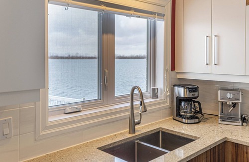 Unique and peaceful WATERFRONT House with private pier on the St-Laurence river. Located only 20 mins from downtown Montreal. Guests have access to six private parking spots. There is lots of fun to be had at this property; whatever floats your boat from fishing all year round, potentially walking on the frozen river; enjoying river activity from the comfort of the bed, bird watching from the multi-level balcony and eating a delicious meal at the dining table while basking in sunlight.