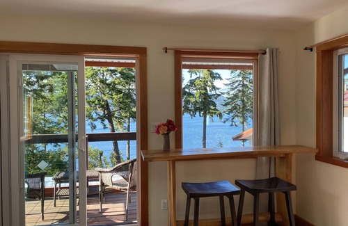 This waterfront tiny house is a self catered suite on the Sooke Basin. You will find a full, well equipped kitchen, little living room, bedroom and small bathroom. Stunning views of the Pacific Oceans calm waters of the Sooke Basin . The well appointed self-contained carriage house is a 375 sq ft studio suite located on the 2nd floor in a seperate building to the main house. As you assend the stairs to the suite you will be greated by a mossy rock with a variety of plants native to the area. The suite itself is perched above the trees and faces the ever changing waterfront ocean views. There is water access on the shore at the bottom of the property. Enjoy the dock, it is a great place to launch your paddle board of Kayak from.